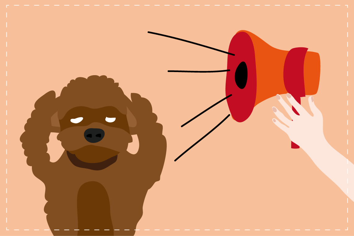 噪音或太大的聲響本來就會使狗狗緊張害怕,例如打雷或是鞭炮聲等等。如果講話聲音太大或是發出尖叫的話,一樣會讓狗狗覺得焦躁;因此在狗狗面前請不要發出太大的噪音,以免嚇到它們。