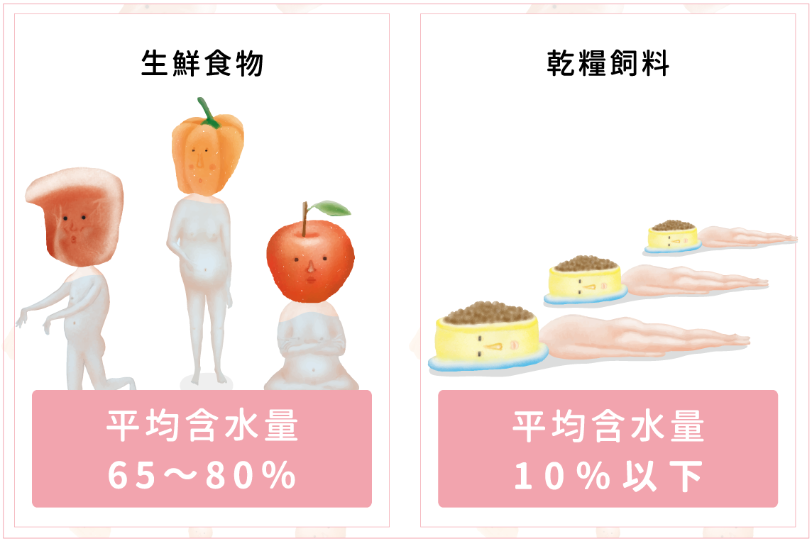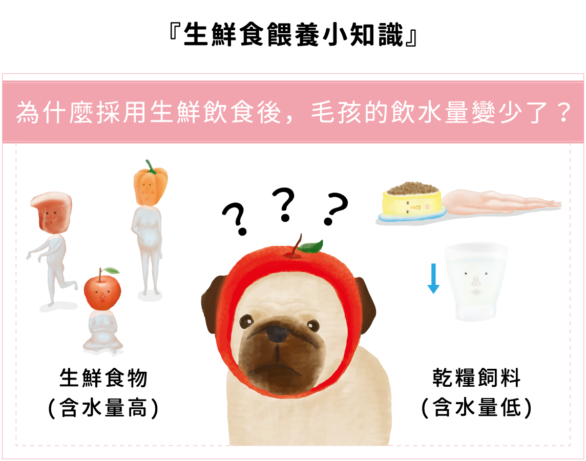 請放心,完全沒有須要特別注意的理由~因為生鮮食的肉品與蔬果飲食中,含水量平均在65~80%,而乾糧飼料的含水量平均在10%以下,差別在生鮮飲食不像乾糧飼料必須經過加熱、濃縮、脫水的過程,所以毛小孩不必消耗更多體內的水份將乾乾恢復水分才能消化,自然讓狗狗及貓咪更不容易感到口渴。