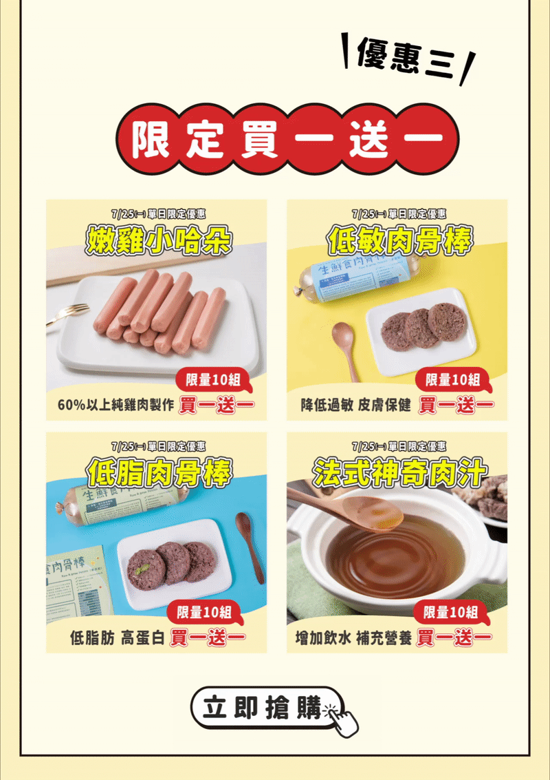 3.7/25買一送一活動中午12點開賣,數量有限,每人限購1組。