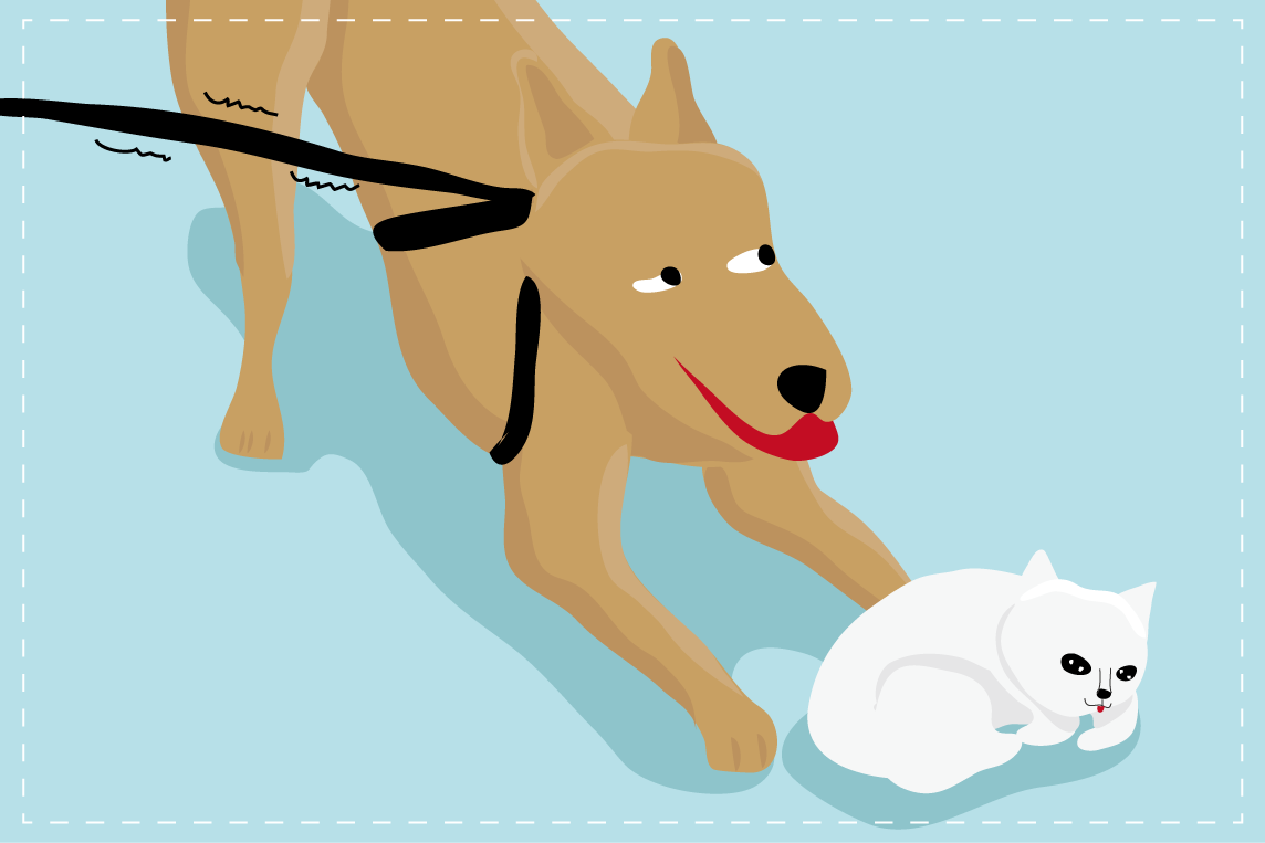 狗有很強的領地意識,如果狗來到一個有貓的家庭,它會認為是自己侵入了貓的地盤,因而對貓比較恭敬。介紹陌生的貓咪和狗狗認識時,要用鏈子控制狗狗。如果貓咪樂意,讓它聞聞狗狗的氣味,但不要讓狗的力量壓倒貓,也不要強迫貓咪接近狗狗。每當狗過於接近貓時,立刻拉緊狗鏈。如果它懂得保持距離,就及時給予獎勵。要讓狗明白,和貓保持距離是必須遵守的家規之一。