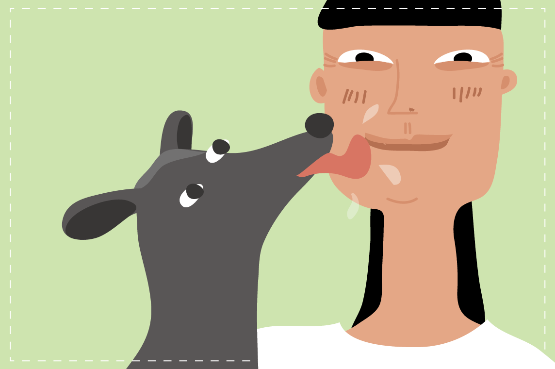 狗狗舔人的臉,其實就是在向主人撒嬌喔,他在告訴你:「我喜歡你」、「和你在一起好安心哦!」帶有服從的意味在;尤其是舔嘴巴附近,代表狗狗真的很喜歡你!