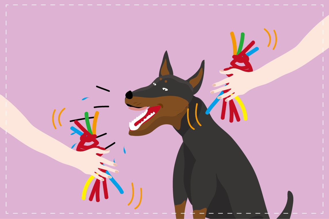 在狗狗叫得興奮時,用牠最喜歡的玩具或骨頭引起牠的注意力,這時狗狗應會去搶奪玩具,而停下吠叫聲。