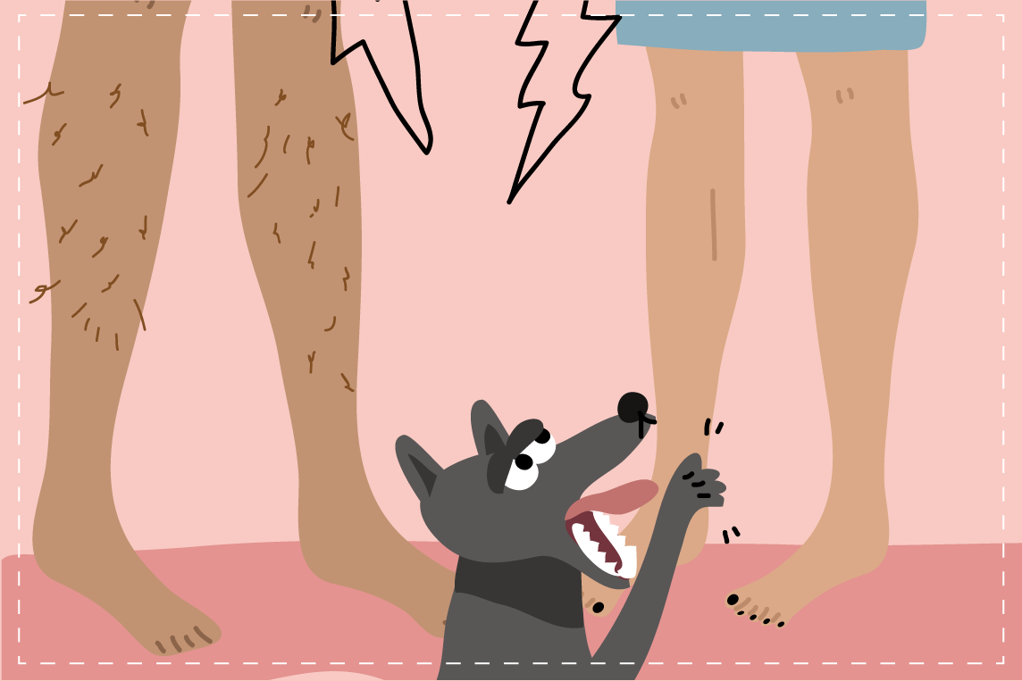 當狗狗把手抓放到主人的身上的同時也出現了舌頭舔嘴巴、打哈欠等動作,代表他很可能正處於緊張不安的狀態,譬如被主人責備,或是主人間的爭執等。這種情況可以先轉移他的注意力,譬如玩玩具或是帶他離開現場,等他冷靜下來再好好安慰他抱抱他。