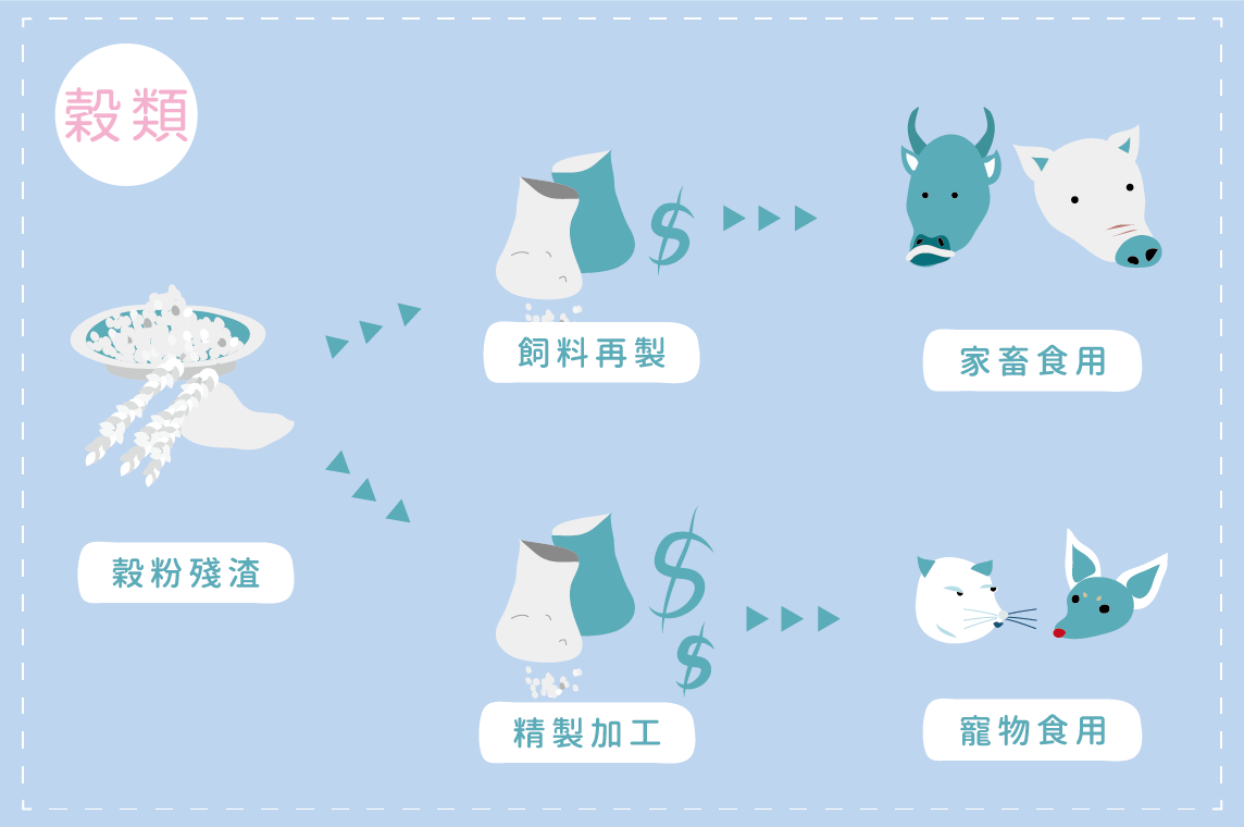 無論東方或是西方,人類在食品工業開始發展後,大宗主食仍以五穀類食物為主,而大量加工後產生的穀粉與殘渣,基本上人們也不吃,自然也就想到以飼料再製的方式給予牛羊豬雞等經濟畜養動物,當然聰明的商人發現如果再加工精製成寵物飼料產品,更能賣出好價格,也因此全世界的寵物飼料市場在這100年的時間逐漸蓬勃發展。