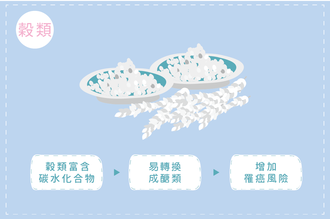 穀類中富含碳水化合物,而碳水化合物易轉換成醣類,癌細胞正是以醣類為能量來源。