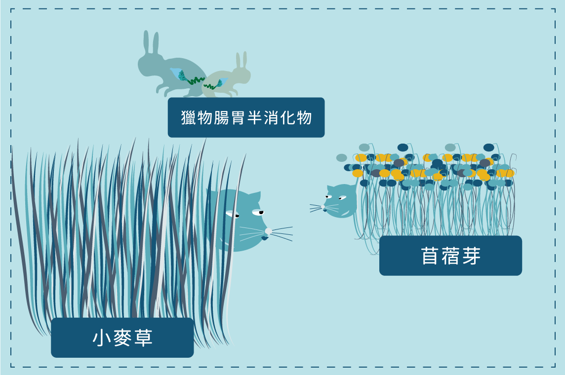 其實在野外與原始貓咪的飲食中,也包含少量植物性食物,像是草葉類(ex.小麥草、苜宿芽類貓草植物),以及獵物中半消化的蔬果或榖物(ex.小鳥、兔子腸胃中半消化物)