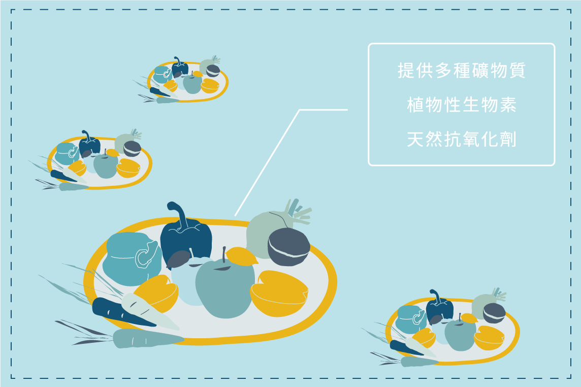 對於肉食性動物來說,蔬果植物中提供了多種礦物質及維生素,當中包括了肉類缺乏的植物性生物素(Pyhtonutrients)及天然抗氧化劑,這兩種營養素對於肉食動物的免疫力增強與延緩衰老都有莫大的幫助。
