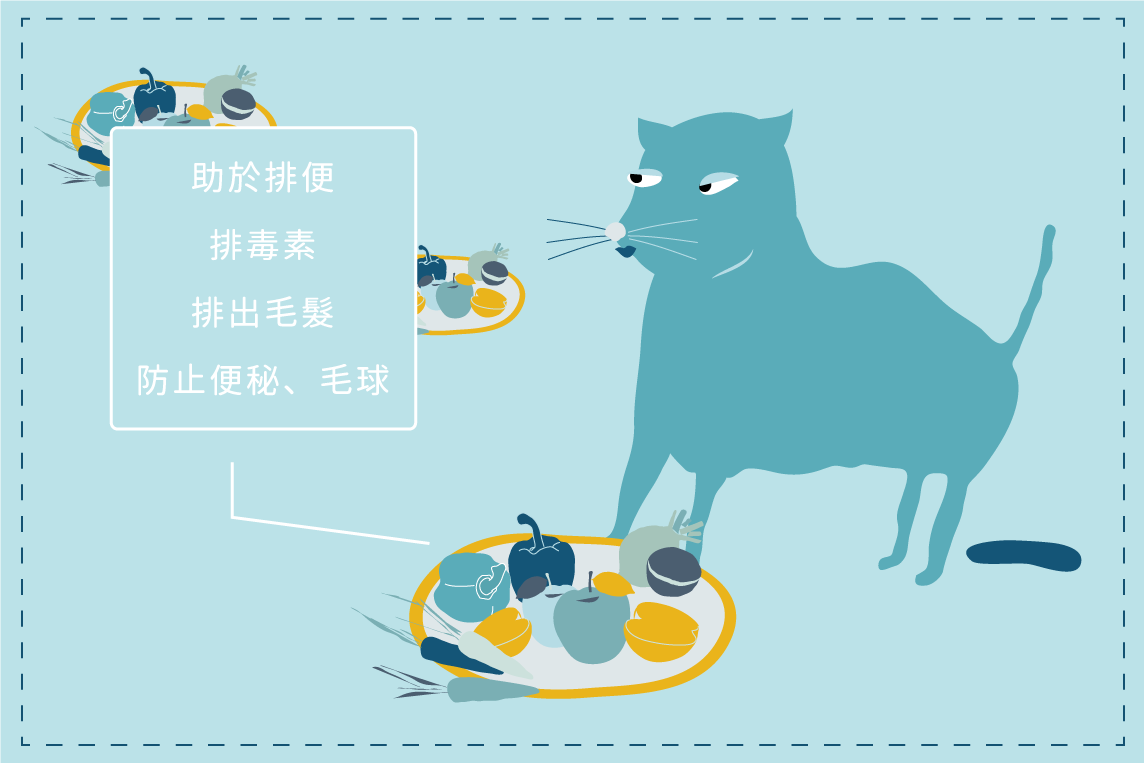 蔬果中的纖維素與葉綠素也有助於貓科動物排便、排毒素及排出吃下的毛髮,更能防治便秘、毛球等有損健康的問題發生。