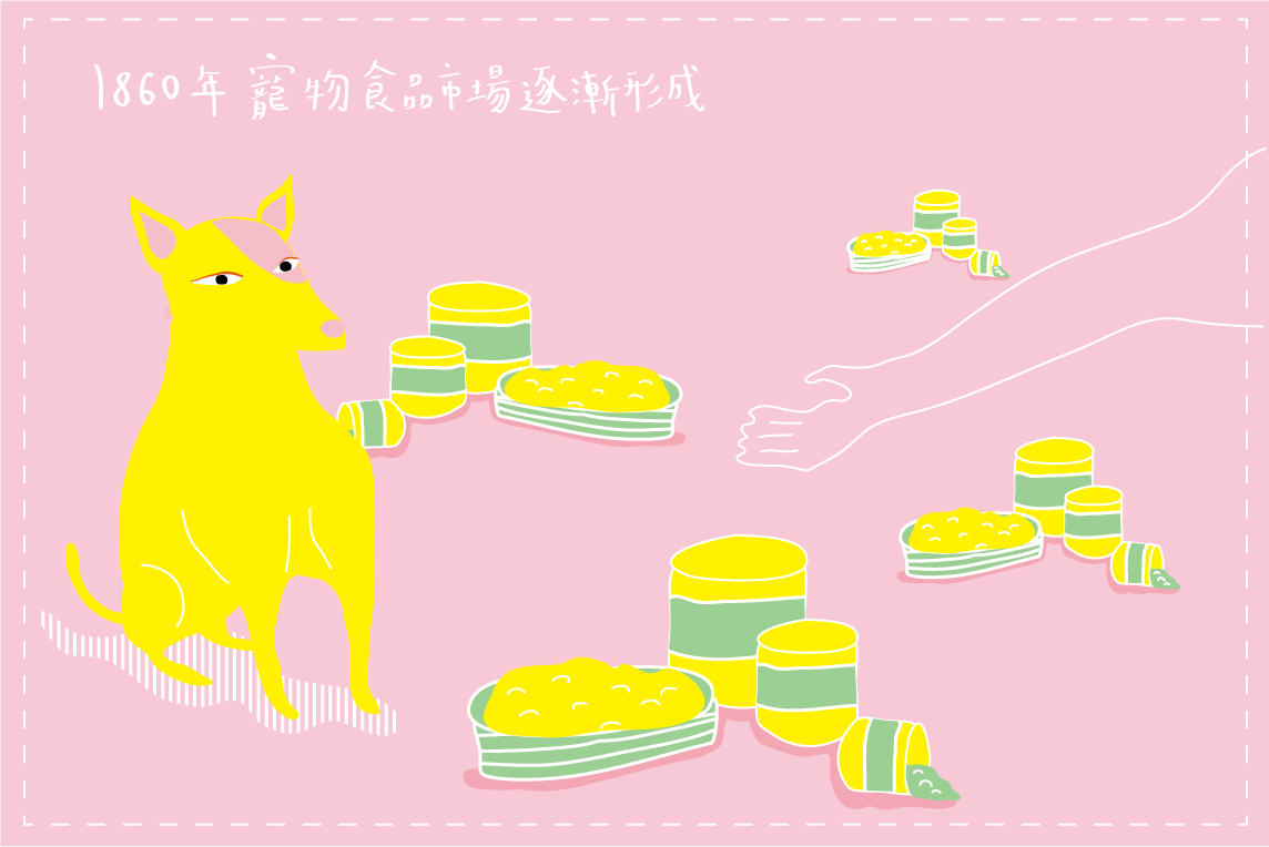 直到1860年英國商人詹姆斯.斯普拉特(James Spratt)使用混和小麥粉、蔬菜粉、牛肉製作出第一個狗餅乾獲得市場成功後,也逐漸形成了寵物食品市場,而最早的狗罐頭則是在1922年於美國生產,當時罐頭的主要成份為『馬肉』,因為當時馬肉成本低廉,且人們不願意食用,隨著時間的變遷與人們觀點的認知改變,馬肉狗罐頭也就走入了歷史。